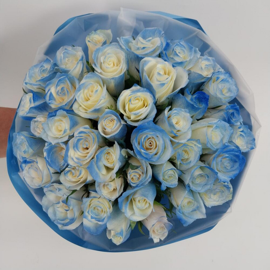 На фото букет из 41 голубой розы. В составе: роза 41 шт, дизайнерская упаковка 1 шт, атласная лента 1 шт, . Все цветы свежие и ароматные, букет красиво оформлен и отлично подходит для подарка. Доступна доставка цветов или самовывоз.