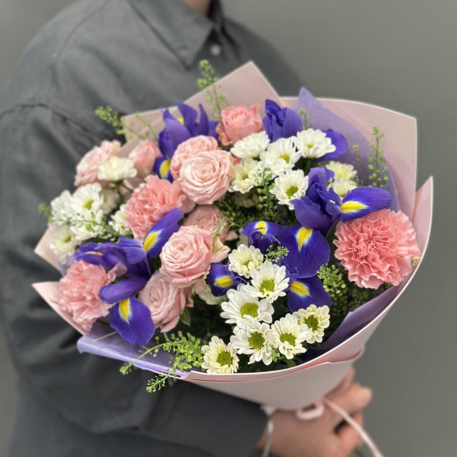 На фото букет «розовый блюз». В составе: кустовая роза 3 шт, гвоздика 3 шт, хризантема кустовая 3 шт, ирис 5 шт, дизайнерская упаковка 1 шт, атласная лента 1 шт, . Все цветы свежие и ароматные, букет красиво оформлен и отлично подходит для подарка. Доступна доставка цветов или самовывоз.